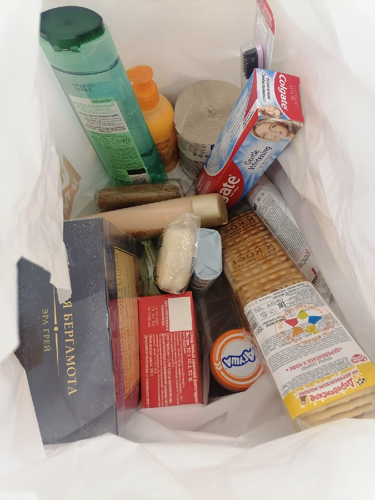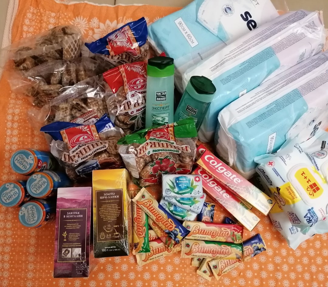 Итог: 54 набора, в которые в основном входят предметы личной гигиены, чай, печенье и пряники, макаронные изделия.